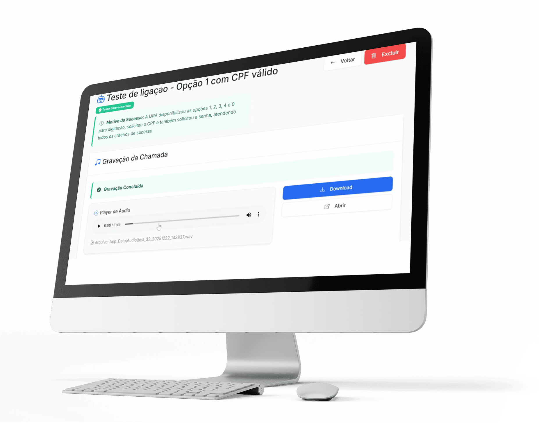 Configure critérios personalizados de sucesso para cada teste. Detecção automática de erros com identificação precisa do ponto de falha. Evidências completas: gravações de áudio + transcrições.
